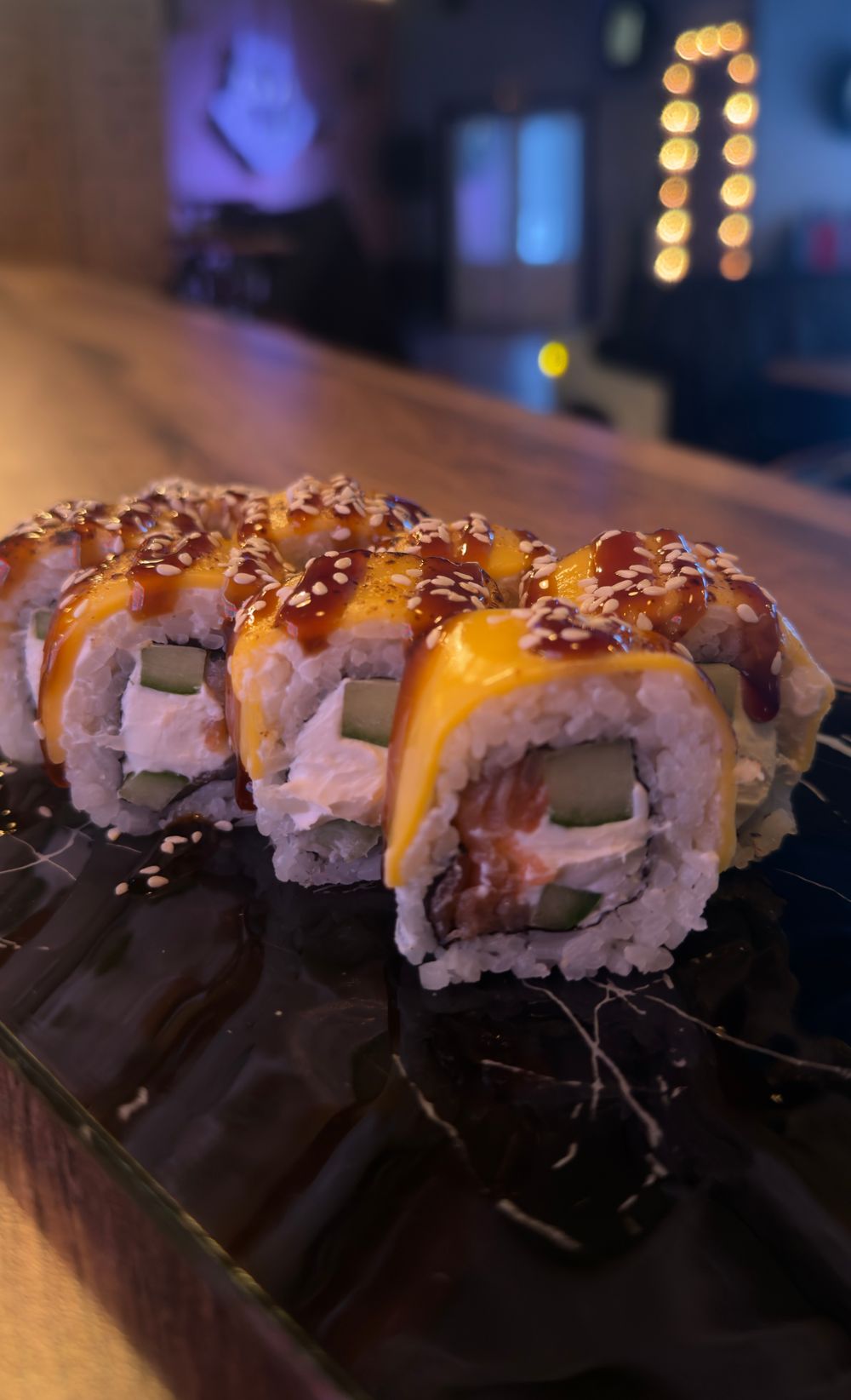 Состав: Лосось, Сыр творожный, Огурец, Сыр чеддер, Соус унаги, Кунжут *Имбирь, васаби, соевый и ореховый соус приобретаются отдельно